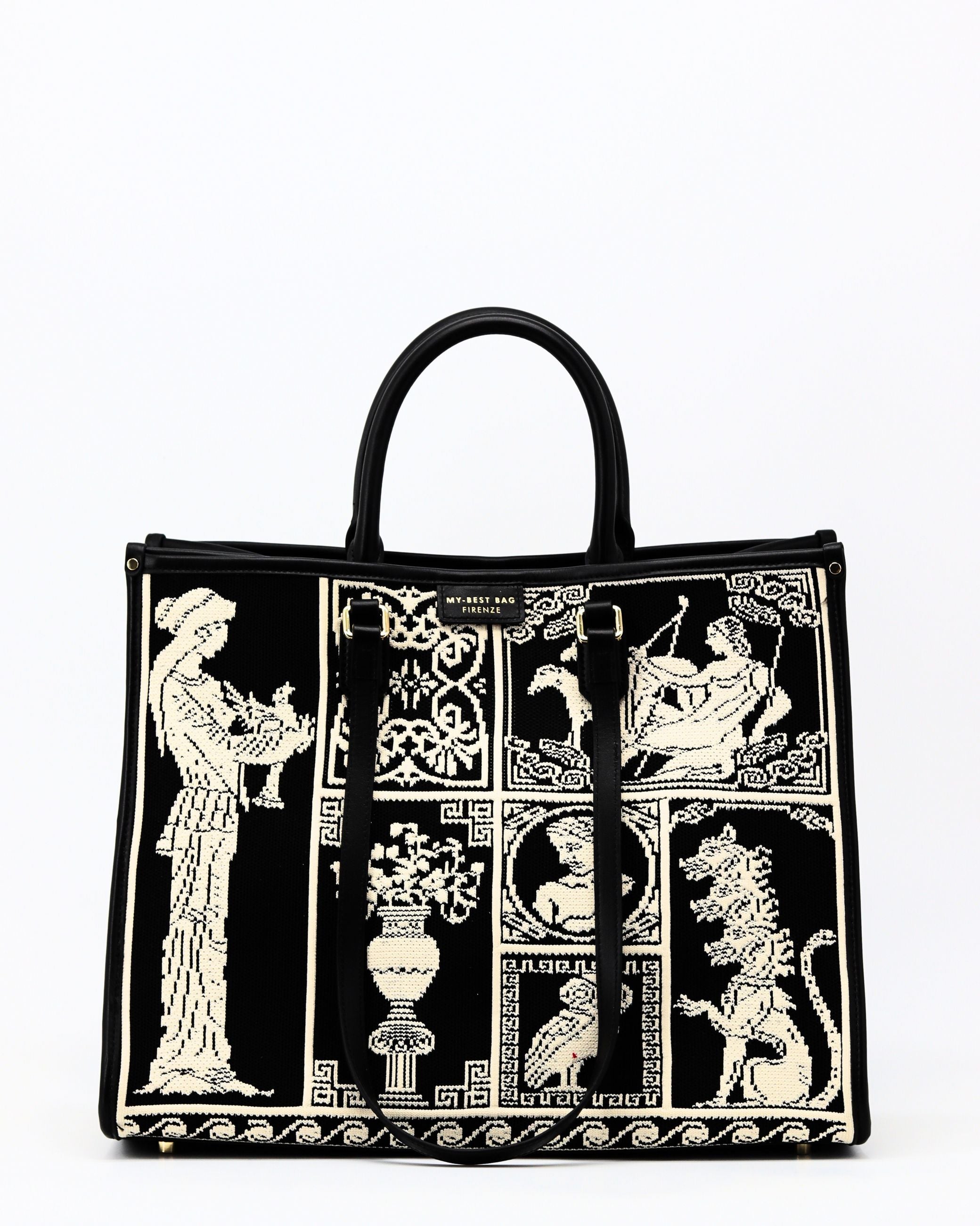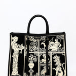Borsa in pelle e tessuto a rilievo con stampa dedicata all’Agorà dell’antica Grecia. Un modello che unisce tradizione e stile contemporaneo, con un effetto materico elegante e immediatamente riconoscibile.